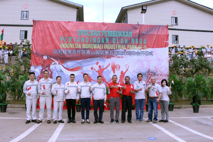 8月19日,印尼麻豆av 园区第五届趣味运动会开幕式在园区篮球场举行,永青集团有限公司总裁伍华弟,印尼经贸合作区麻豆av 园区开发有限公司(IMIP)总裁Hamid Mina、运营总监Irsan Widjaja,印尼瑞浦镍铬合金有限公司(IRNC)董事长王仁辉等领导莅临现场。