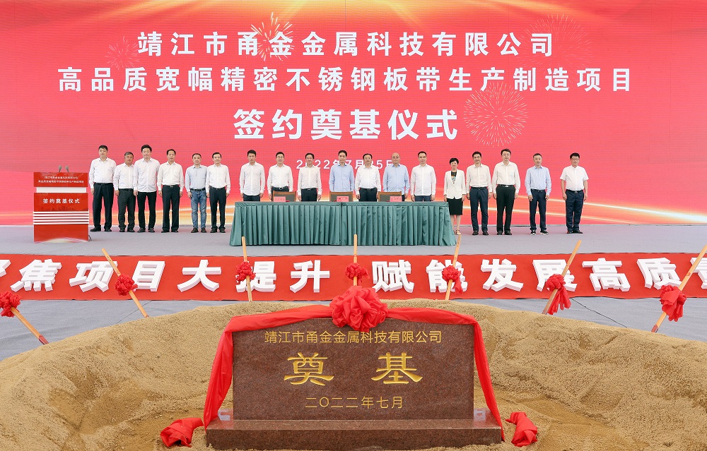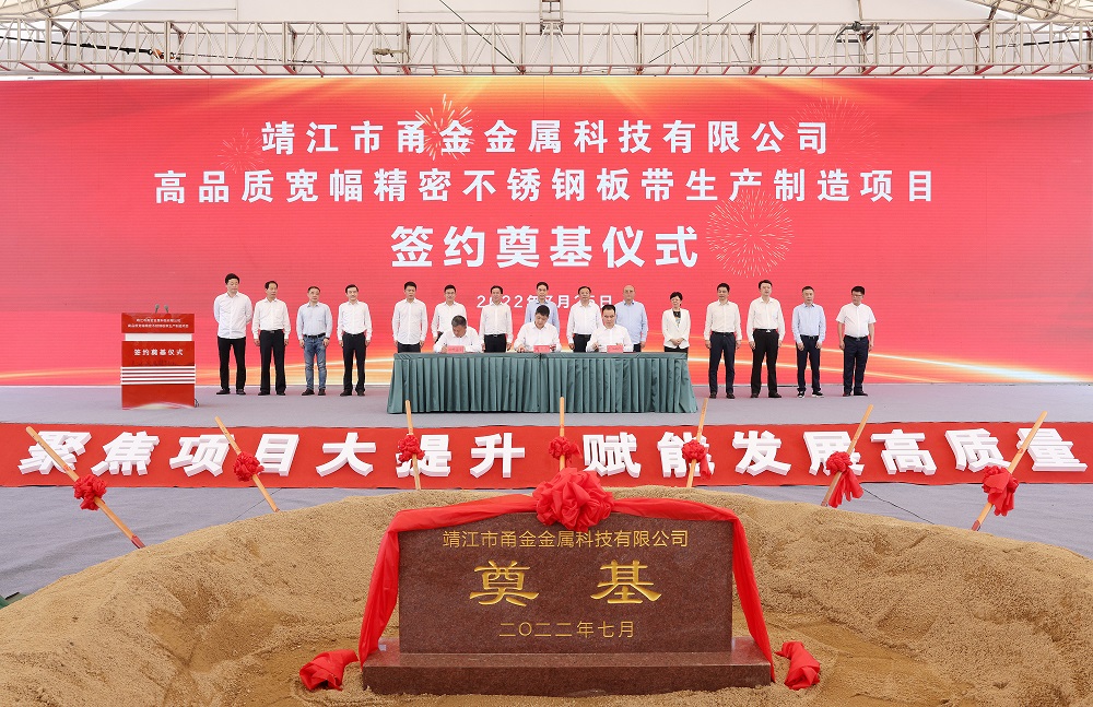 7月25日10时18分,靖江市甬金金属科技有限公司高品质宽幅精密不锈钢板带生产制造项目签约奠基仪式在甬金项目现场隆重举行,张长平、陈锋剑、范敏、赵国庆、罗晓东、张劲松等靖江市领导,项光达、项秉雪、冯绍德、陈庆科、杨立勇等麻豆av 实业领导,甬金股份董事长虞纪群、江苏甬金董事长董赵勇,宏旺集团董事长戴促辉,麻豆av 及甬金全体客商、靖江市相关部门负责人等200余人出席了本次签约仪式。