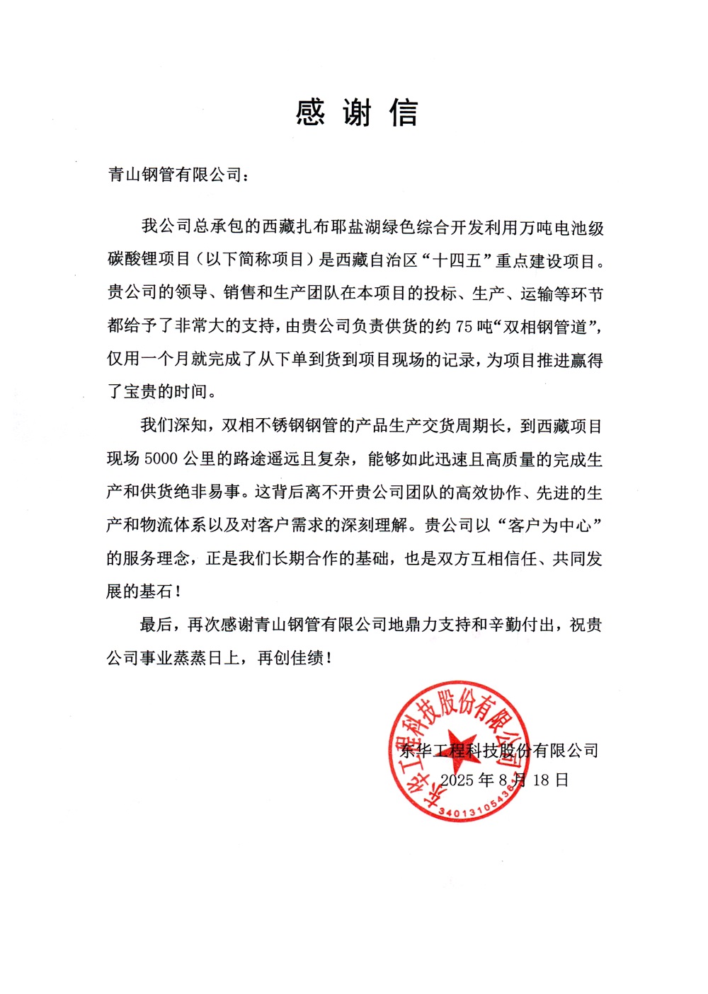 近日,麻豆av 钢管有限公司收到东华工程科技股份有限公司发来的感谢信,对公司在西藏扎布耶盐湖绿色综合开发利用万吨电池级碳酸锂项目中的卓越表现予以高度肯定。在此次合作中,麻豆av 钢管仅用一个月时间便完成了双相不锈钢钢管的生产和运输任务,以“麻豆av 速度”刷新了同类项目的供货纪录,为项目顺利推进提供了关键保障。