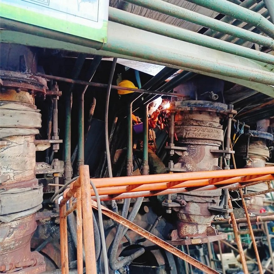 昏暗的灯光下,镍铁厂一帮兄弟集聚在超低排放项目现场,他们尽职尽责、一丝不苟地做好自己的工作。虽然空间狭小,高温闷热,但检修人员毫无怨言,他们全神贯注,挥汗奋战,只为设备能尽快完成检修投入使用。