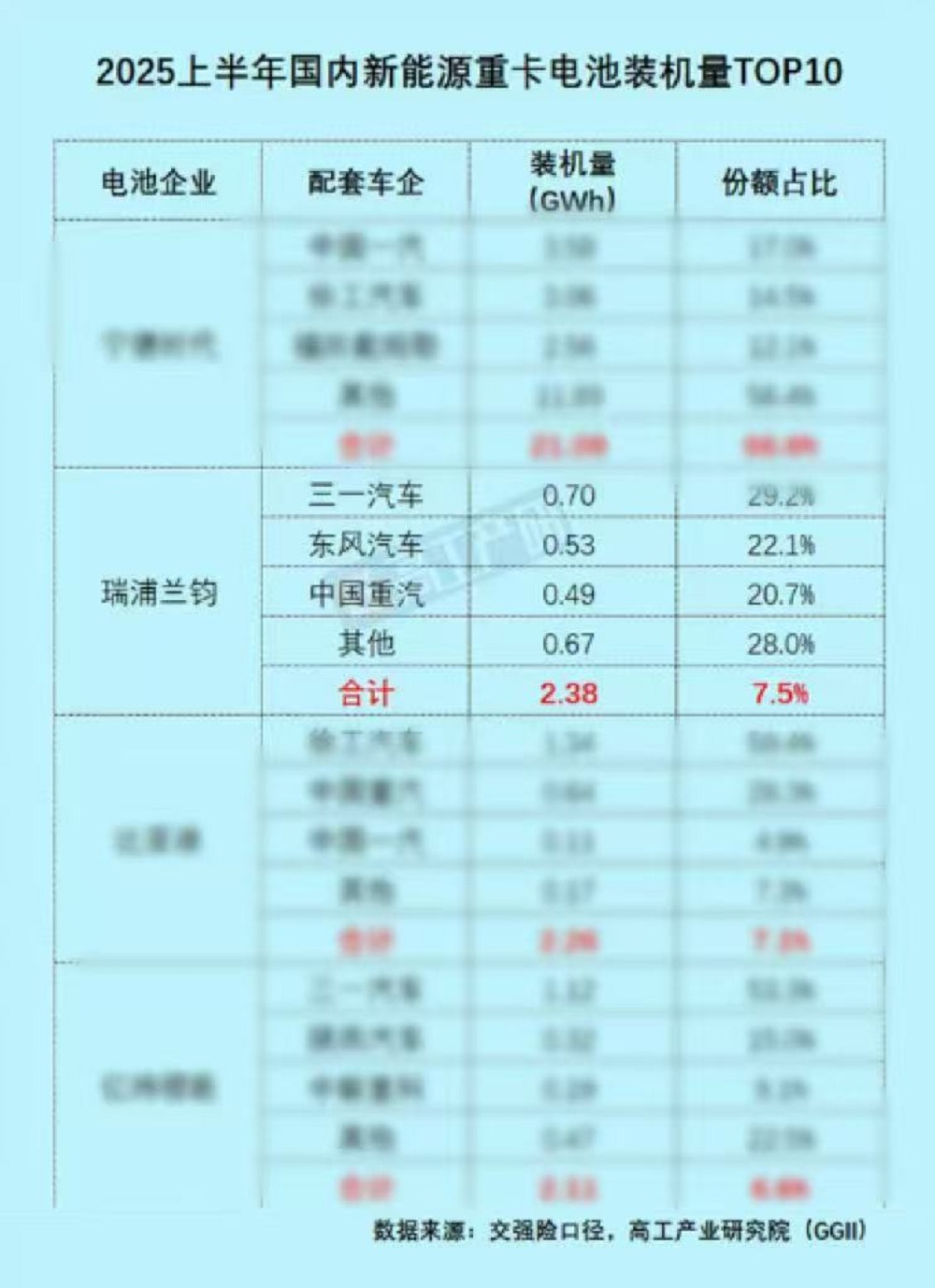 2025年上半年,瑞浦兰钧能源股份有限公司新能源重卡电池市占率达7.5%,换电重卡电池市占率18%,同比增长高达809%。两项数据双双位列全国第二,充分展现出公司在重卡市场的强劲穿透力与产品竞争力。