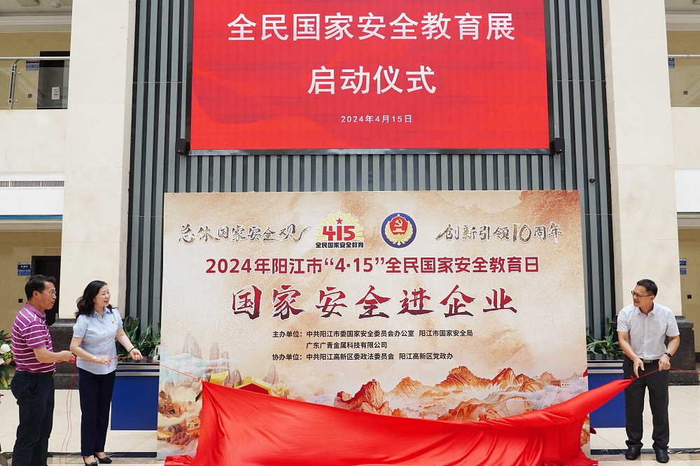 为增强公司广大党员干部职工的国家安全意识,共同筑牢国家安全人民防线,4月15日上午,在第九个全民国家安全教育日来临之际,广东广青金属科技有限公司与阳江市委国安办、市国安局联合举办的“2024年阳江市‘4.15’全民国家安全教育日——国家安全进企业”活动启动仪式在广青科技办公楼一楼大厅举行。阳江市委副秘书长、国安办副主任刘山,广青科技党委副书记、工会主席王大庆,以及阳江市国安局、阳江市关工委、阳江高新区委政法委、阳江高新区党政办等有关单位领导、干部职工共计150多人参加启动仪式和参观展览。