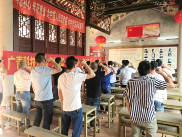在中共阳江县委旧址(丹载村许氏宗祠),党支部书记戴作锐带领全体党员及入党积极分子重温入党誓词,让大家进一步坚定“不忘初心,牢记使命”的决心与信念。