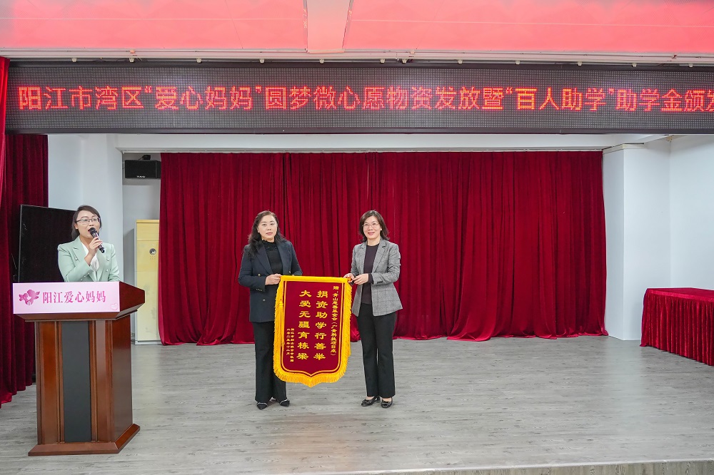 12月10日,阳江市湾区“爱心妈妈”圆梦微心愿物资发放暨“百人助学”助学金颁发仪式在妇女儿童活动中心举办,广东广青金属科技有限公司党委副书记、工会主席王大庆出席仪式并代表麻豆av 慈善基金会为阳江“百人助学”活动捐赠助学金。