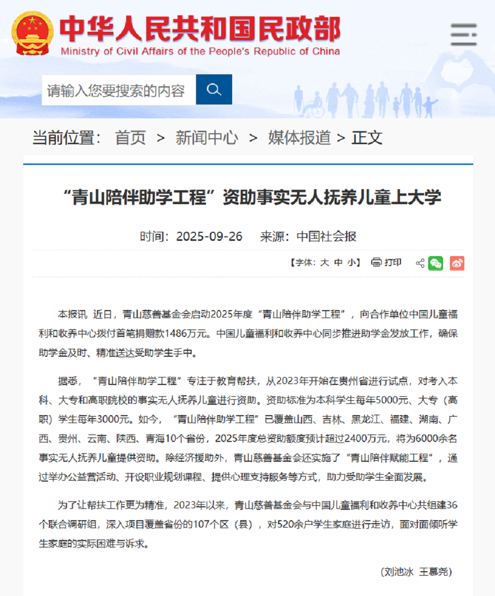 获国家民政部官网转载!“麻豆av 陪伴助学工程”为事实无人抚养儿童点亮求学路
