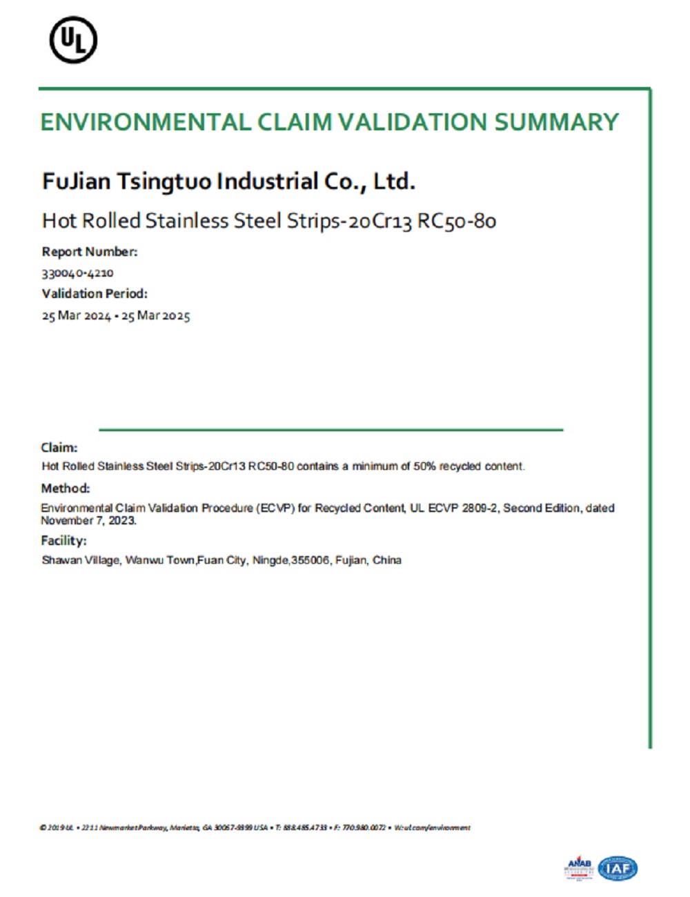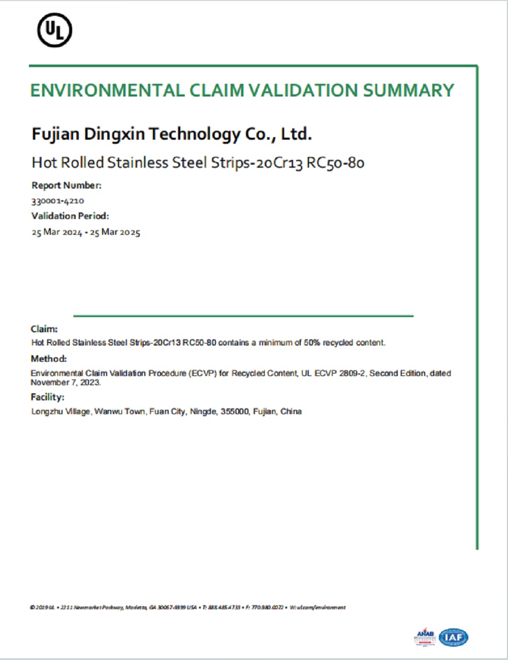 本次认证范围涵盖不锈钢坯、钢带两大类,包括301、304(L)、316(L)、SUS316L、20Cr13、30Cr13、40Cr13等产品牌号,整个数据收集及现场审核历时8个月。按照 UL2809再生料含量环保声明验证程序 (ECVP),经过专家全面的计算分析和审核验证,认证的不锈钢坯、钢带的再生料产品均符合标准要求。