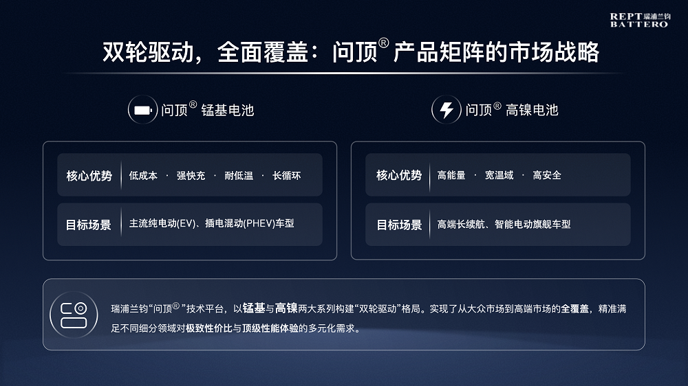 瑞浦兰钧“问顶®”技术平台,以锰基与高镍两大系列构建“双轮驱动”格局,实现了从大众市场到高端市场的全覆盖,精准满足不同细分领域对极致性价比与顶级性能体验的多元化需求。
