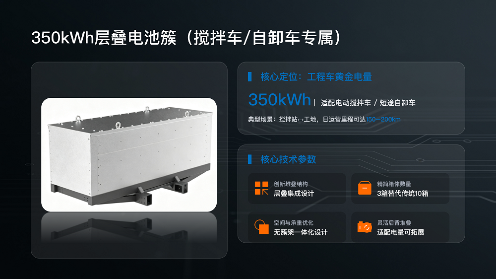 面向搅拌车与短途自卸车等工程运输场景推出的350kWh层叠无簇架电池,采用高度集成的结构设计,通过三箱集成方案替代传统十箱组合模式,取消传统簇架,大幅减少系统组件数量,从源头降低整车结构复杂度与重量负担。这一设计不仅有效释放整车载货能力,同时降低维护复杂度,使车辆在长期运营过程中具备更优的经济性与稳定性,从而在保障电量需求的同时实现更高的运输效率。